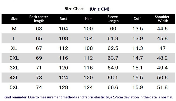 Sizes: M, L, XL, 2XL, 3XL, 4XL, 5XL