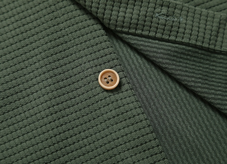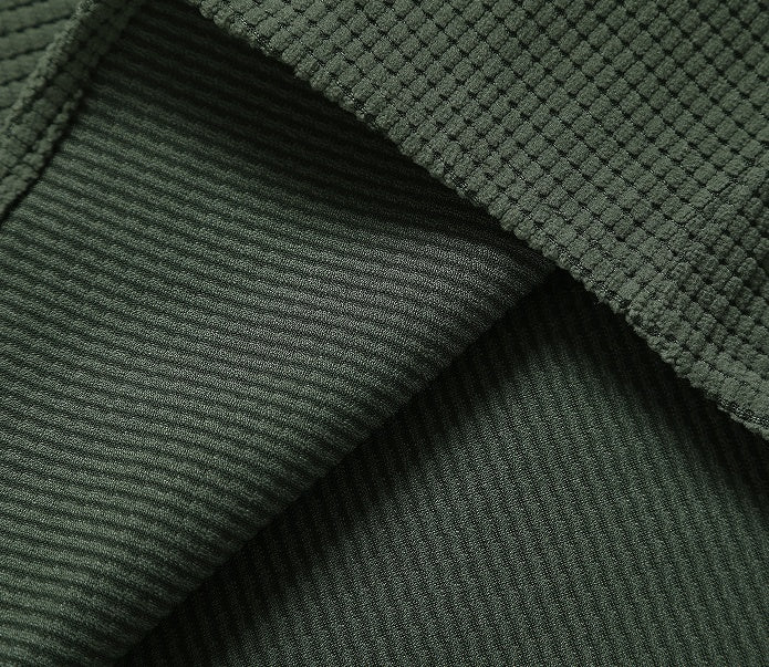 2. ** Waffle Pattern ** : The surface features a fine grid-like texture, which is understated and has a sense of quality. It is more layered than ordinary solid-colored shirts, and it is retro yet modern.